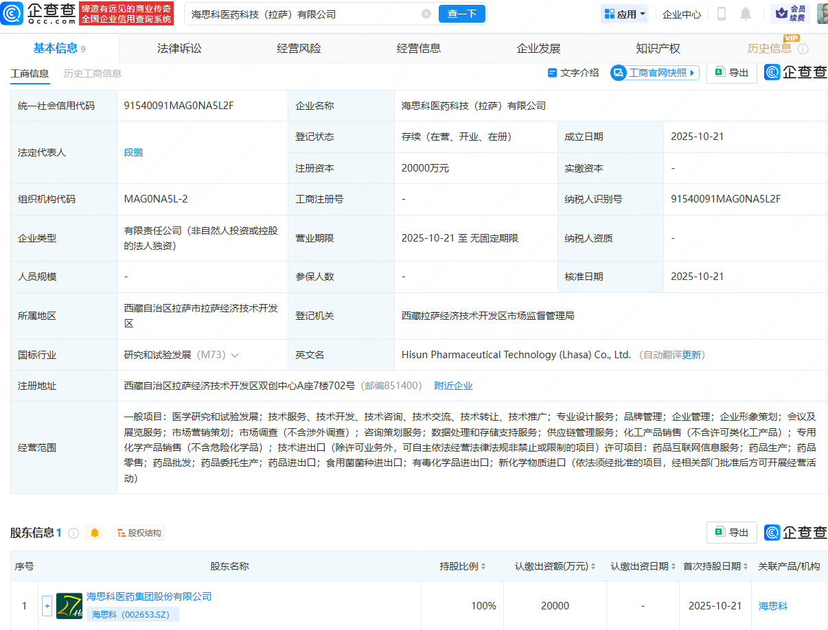 近日,海思科医药科技(拉萨)有限公司成立,法定代表人为段鹏,注册资本为2亿元配资炒股,经营范围包含:专业设计服务;品牌管理;企业管理;药品互联网信息服务;药品生产;药品零售;药品批发等。企查查股权穿透显示,该公司由海思科(002653)全资持股。